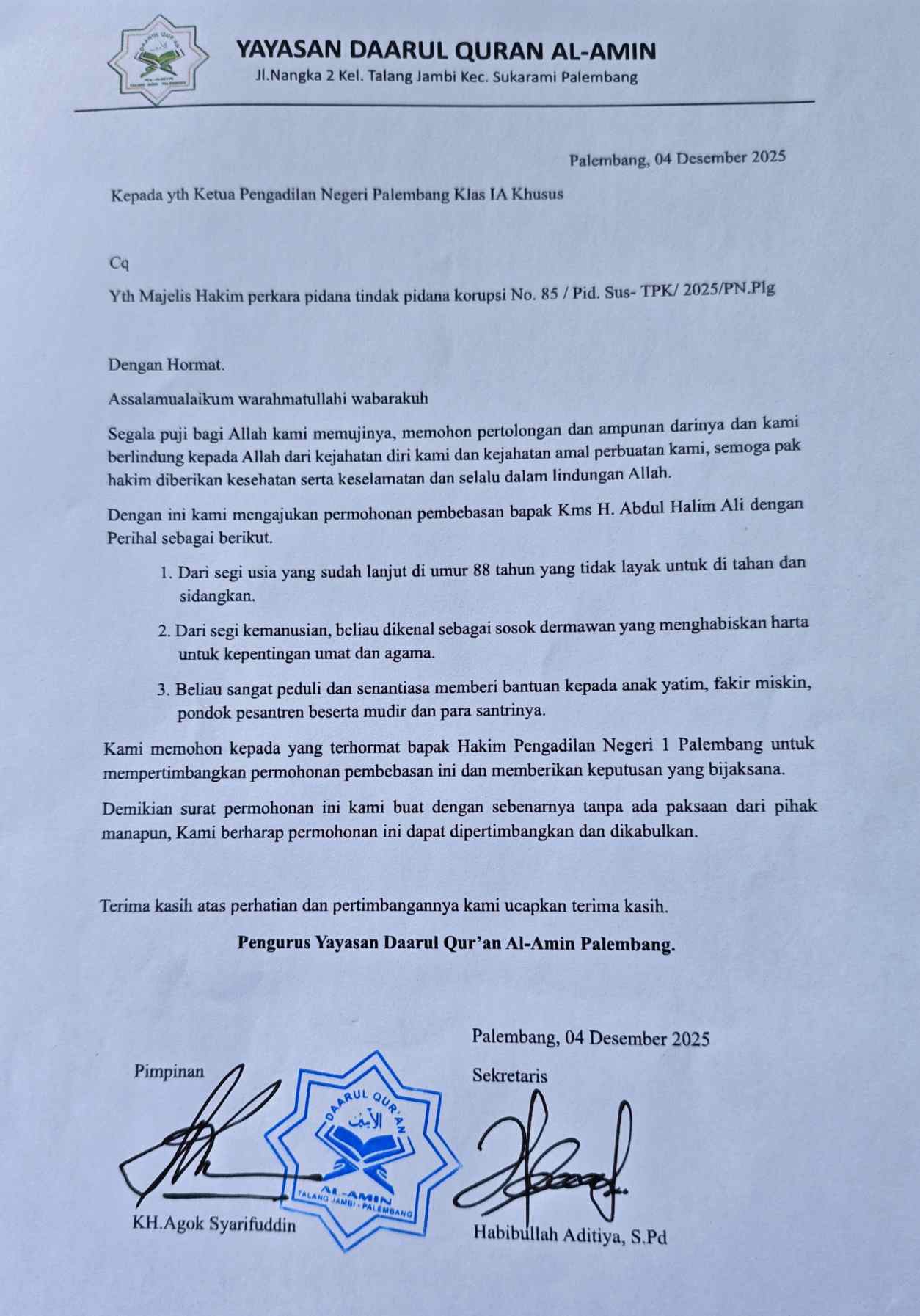 “Kami sudah menyerahkan surat permohonan amicus curiae kepada Haji Halim. Kami memohon kepada yang terhormat Hakim PN Tipikor Palembang untuk mempertimbangkan permohonan pembebasan ini dan memberikan keputusan yang bijaksana. Kami berharap permohonan ini dapat dipertimbangkan dan dikabulkan,” kata KH Agok Syarifuddin, Kamis (4/12/2025).