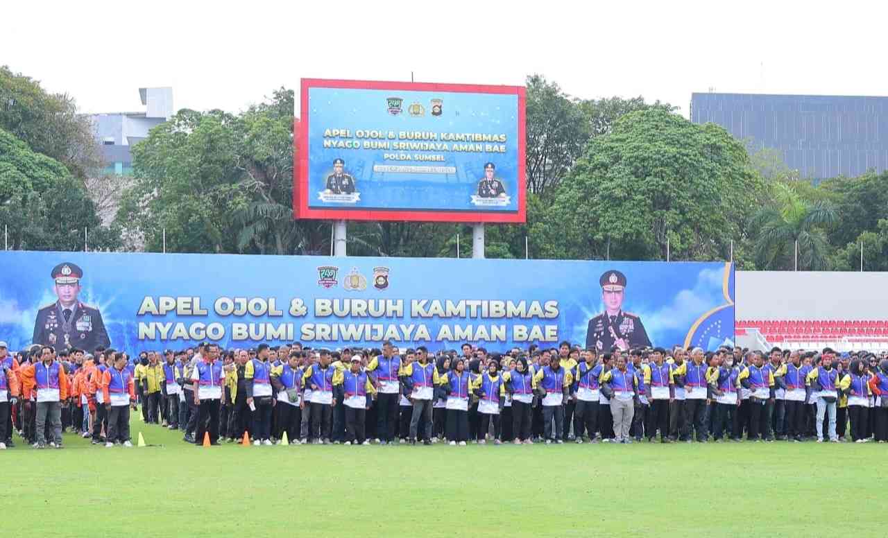 SUMSELTIMW.COM, Palembang – Sebanyak 5.000 pengemudi ojek online (ojol) dan elemen buruh memadati Stadion Gelora Bumi Sriwjaya dalam apel besar bertajuk “Nyago Bumi Sriwijaya Aman Bae”, Minggu (8/3/2026).